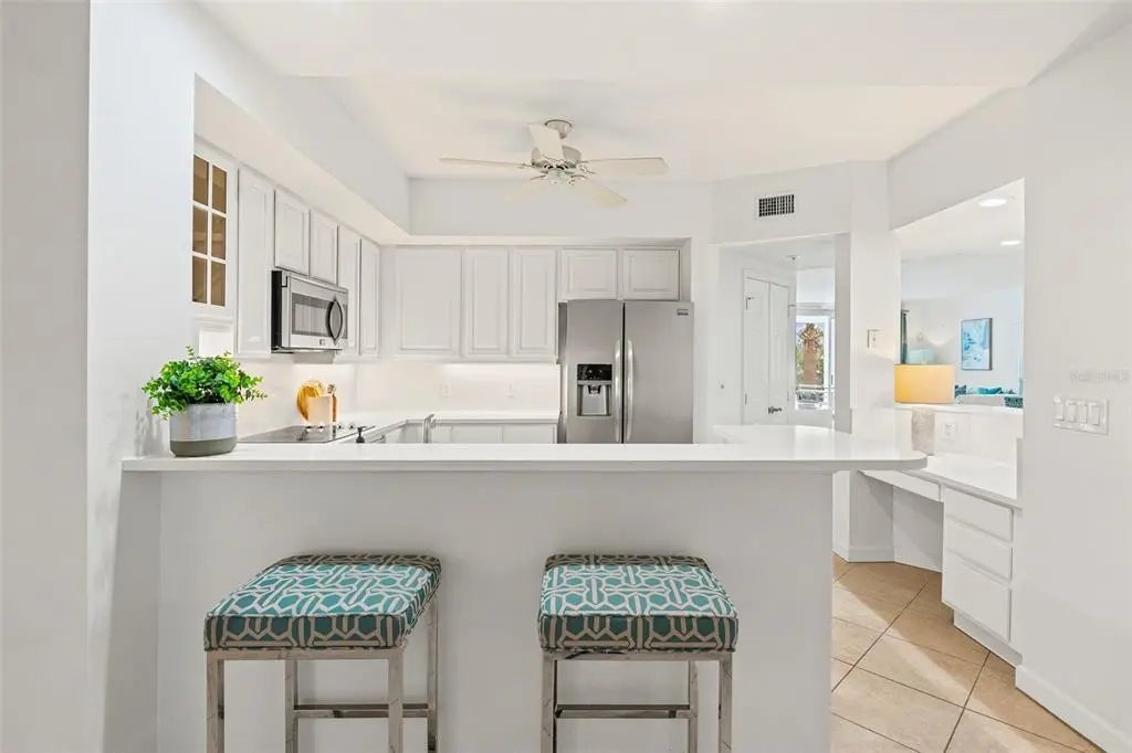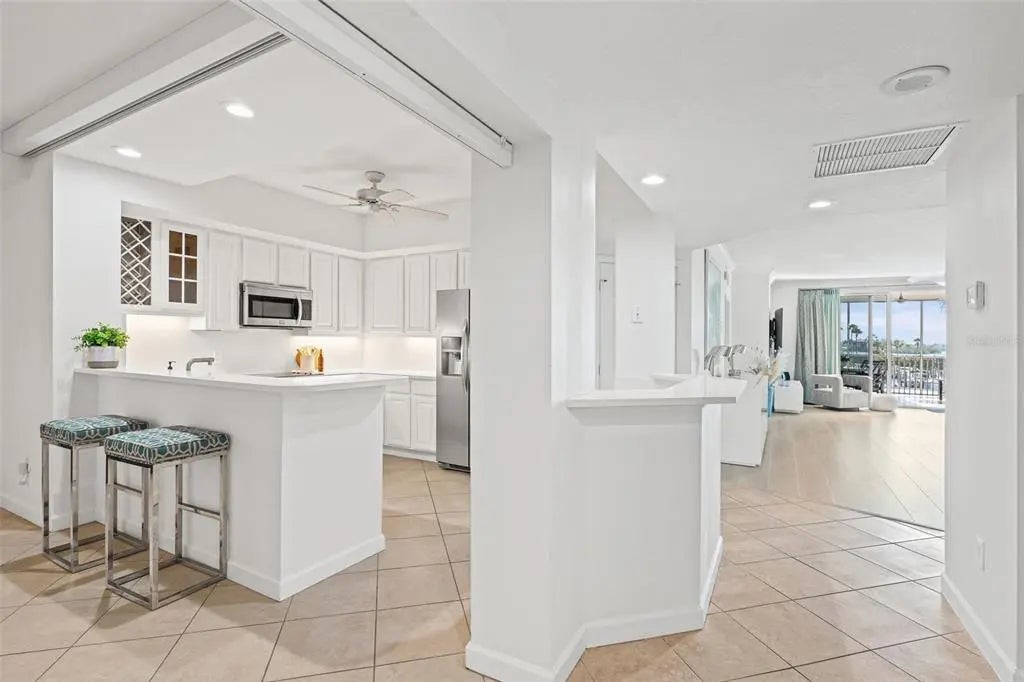 Newly installed white quartz countertops and freshly painted cabinets make the kitchen bright and cheery in this expansive 2-bedroom, 2-bath residence. With breathtaking bay views, the interior boasts an impressive 1,915 square feet of under-air living space, complemented with covered lanais in both front and back and a convenient sunning deck. The interior features both a living room and a family room, a split bedroom plan with ensuites, and hard surface flooring throughout. HVAC and hot water heater replaced in 2024. Rare to properties on the key, there is also a private one-car garage under the building, supplemented by ample open parking. Just a short walk to the public beach, Dolphin Bay offers an array of amenities, including a clubhouse, pool, spa, tennis courts, fitness center and day dock. This gated, pet-friendly community is ideal for those seeking an active waterfront lifestyle in a social and vibrant environment. Take advantage of the trolley stop located right out front, providing easy access to live entertainment and dining options throughout Siesta Key. With exterior painting and elevator renovations complete, now is the time to live your best life at Dolphin Bay!