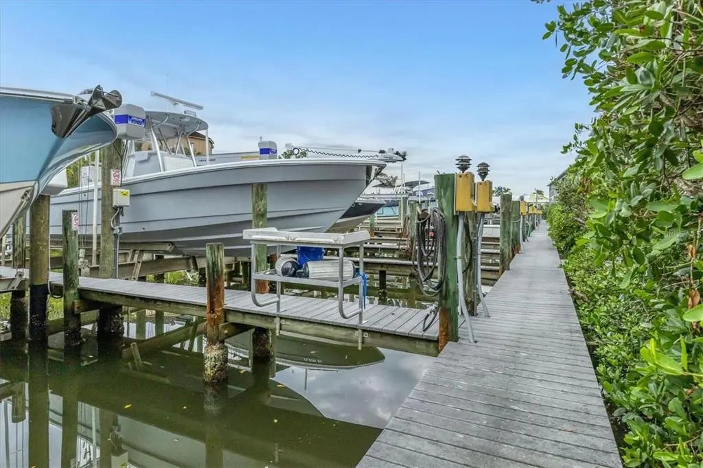 LOCATION< LOCATION< LOCATION! Welcome boating and beach lovers. This 2 bedroom, 2 bath first floor condo with a one car garage on Siesta Key will fulfill all your dreams! Spend the day on the famous Siesta Key Beach (just steps away) then take a sunset boat ride from your own boat slip! Play tennis/pickle ball on the private courts, lounge by the pool or fish out your back door. This condo is being offered turnkey furnished. Updated kitchen with granite countertops and stainless-steel appliances. The kitchen is open to the dining and living rooms with lots of light. Enjoy water views from the screened lanai, while watching fish jump and manatees play. The large master bedroom has an ensuite bathroom with a double vanity and walk in closet. Harbour Towne is a gated community of 50 waterfront units and the amenities include a heated pool, hot tub, tennis/pickle ball court, clubhouse and a picnic area with grills. Walk or take the trolley to lively Siesta Key Village with its many restaurants and shops. Florida living at its best!
