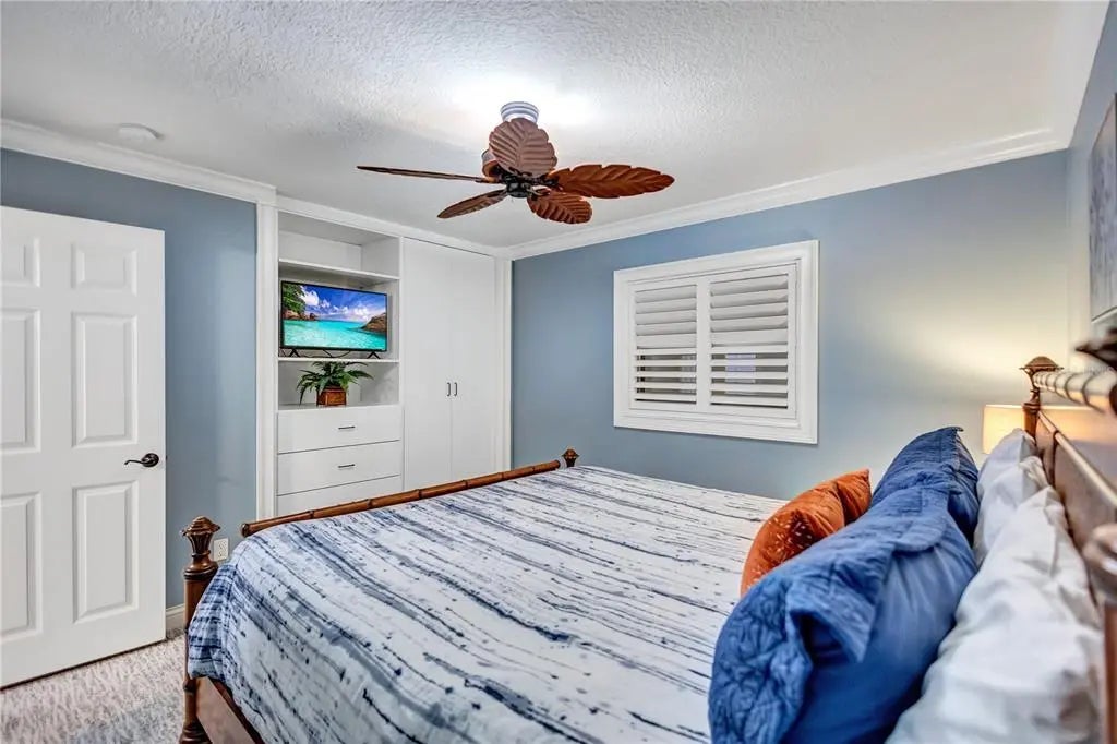 - Interior FeaturesBuilt-in Features, Ceiling Fan(s), Crown Molding, High Ceilings, Kitchen/Family Room Combo, Open Floorplan, Solid Wood Cabinets, Stone Counters, Window Treatments