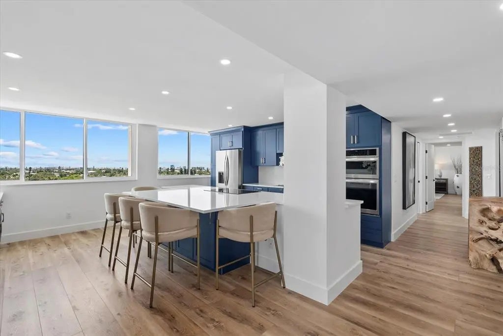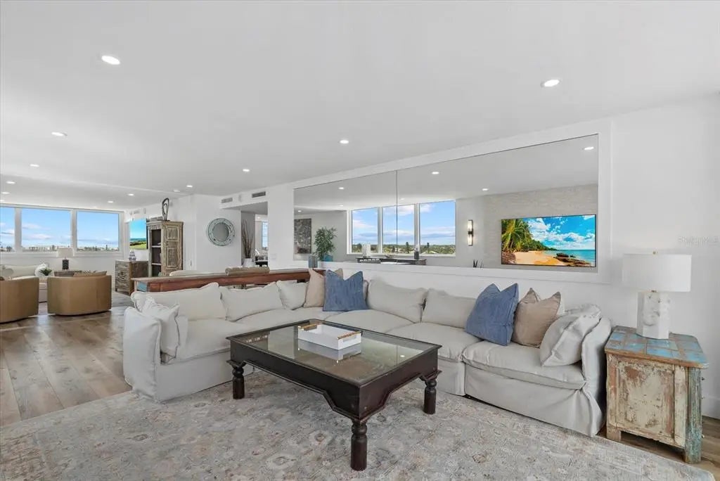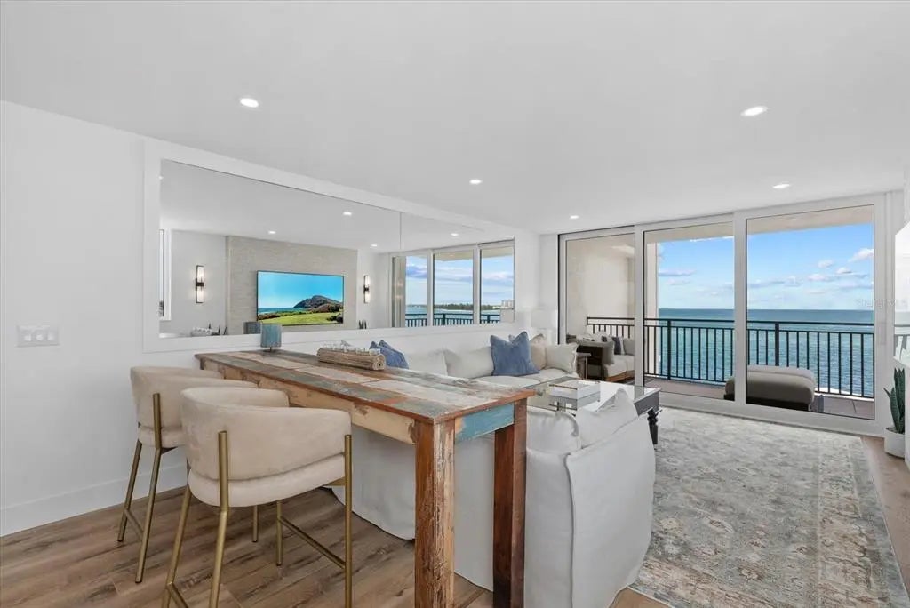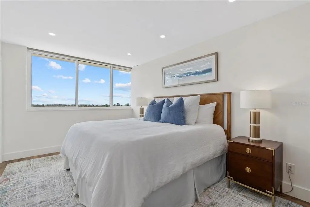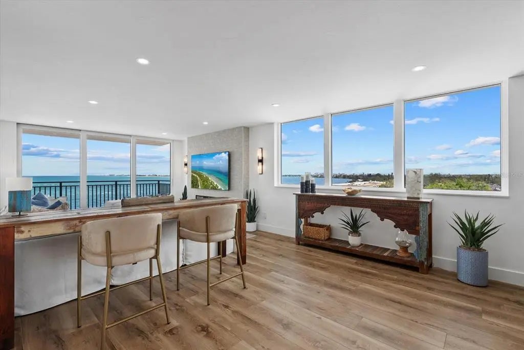 Perched high above the shoreline, Residence 8C at Siesta Towers delivers nearly 360-degree views spanning the Gulf, Big Pass, Sarasota Bay, and the twinkling downtown skyline. From glowing sunsets to sparkling city lights, this vantage point is among the most extraordinary on Siesta Key. Rarely available, this three-bedroom, three-bath residence has just undergone a complete, top-to-bottom remodel. Every detail was thoughtfully curated with todayâs luxury buyer in mindâoffering the ease of brand-new finishes within an iconic Siesta Key location. Designed with a sleek, modern aesthetic, the open floor plan showcases impact-rated windows and sliding glass doors, wide-plank luxury flooring, custom recessed lighting, and a seamless indoor-outdoor flow. The all-new designer kitchen is appointed with quartz countertops, custom soft-close cabinetry, premium stainless-steel smart appliances, and a striking island ideal for entertaining. Each of the three en-suite bathrooms has been fully redesigned with spa-level finishes, frameless glass showers, elegant tilework, and contemporary fixtures. The spacious primary suite is a retreat in itself, featuring a tranquil en-suite bath and panoramic water views. Siesta Towers is a secure, well-managed waterfront community offering an enviable lifestyle. Building amenities include secure access-controlled entry, 24/7 security, a remodeled club room, fitness room, heated waterfront pool, BBQ grills, fishing dock, social dock, bike storage, and more. Just beyond your door, Siesta Villageâs restaurants, shops, and nightlife are a short stroll away, with the powdery sands of world-renowned Siesta Beach minutes from home. This residence combines the rarity of a three-bedroom layout with a brand-new, complete remodel and nearly all-around viewsâan exceptional opportunity to own one of Siesta Keyâs most striking vantage points.