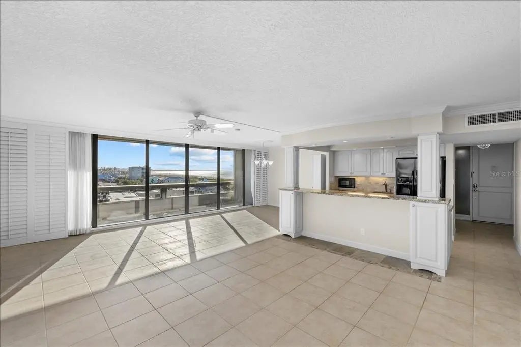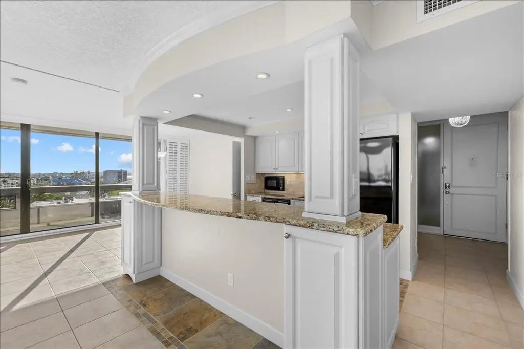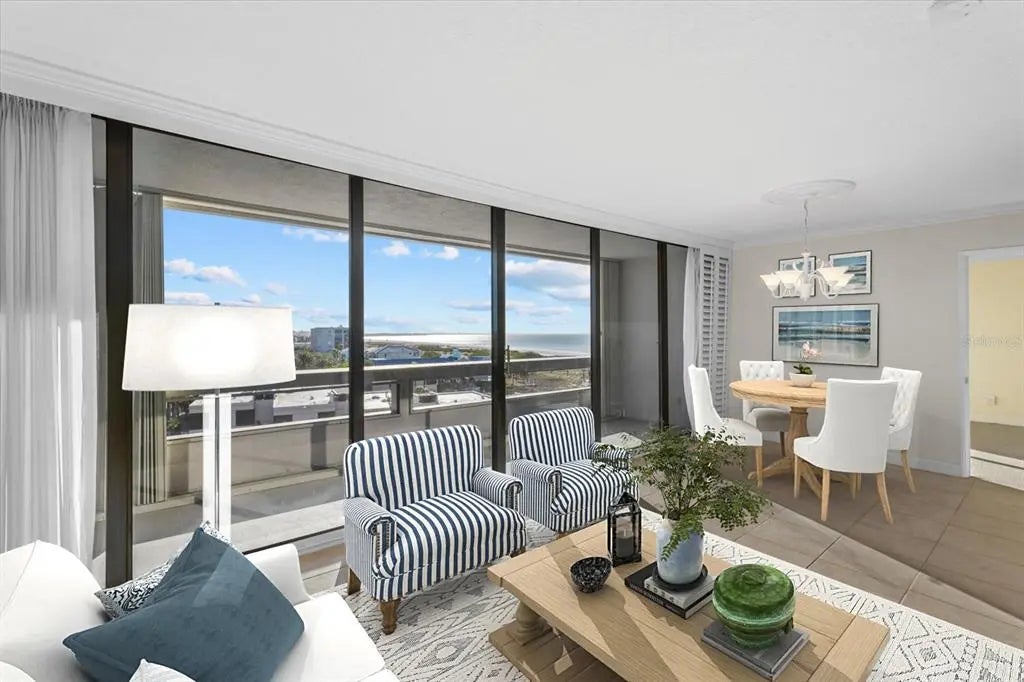 One or more photo(s) has been virtually staged. The Beach Terrace building is one of the most desirable addresses on Siesta Key with a direct Gulf of Mexico location and nestled at the end of the village. This 2 bedroom / 2 full bath corner residence offers panoramic views of the Siesta Key beach, village and aqua water of the Gulf of Mexico. The condominium offers 3 spacious balconies to enjoy morning coffee, evening sunsets and the skyline of downtown Sarasota in the distance. Enter the split floor plan residence through the entry with tiled flooring into the kitchen. The kitchen boasts updated cabinetry, appliances, lighting, granite countertops. The large living area offers dual sliders that provide expansive views throughout Siesta Key and the beach. You can enjoy just relaxing on the couch and viewing the sparkling waters of the gulf. The dining area also provides ample space for entertaining. The primary bedroom has a private balcony with views of the gulf and village. There are two full size beds and an ensuite bath and vanity area including updated tile, cabinetry and granite countertops. The second bedroom offers a full bed with an additional full sliding door for and dazzling views of the gulf. This bedroom also provides an additional bathroom with updated cabinetry, tile shower and granite. The onsite amenities include elevated heated saltwater pool, fitness center, community room all steps from private beach.