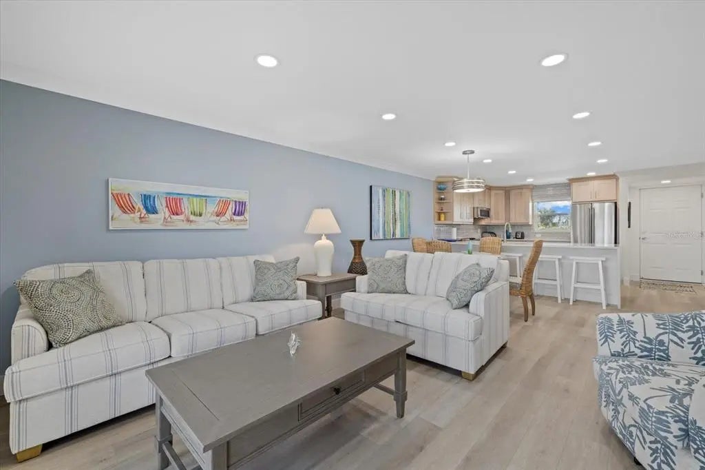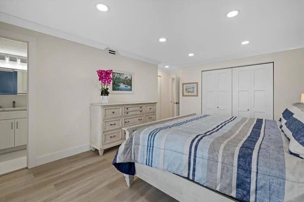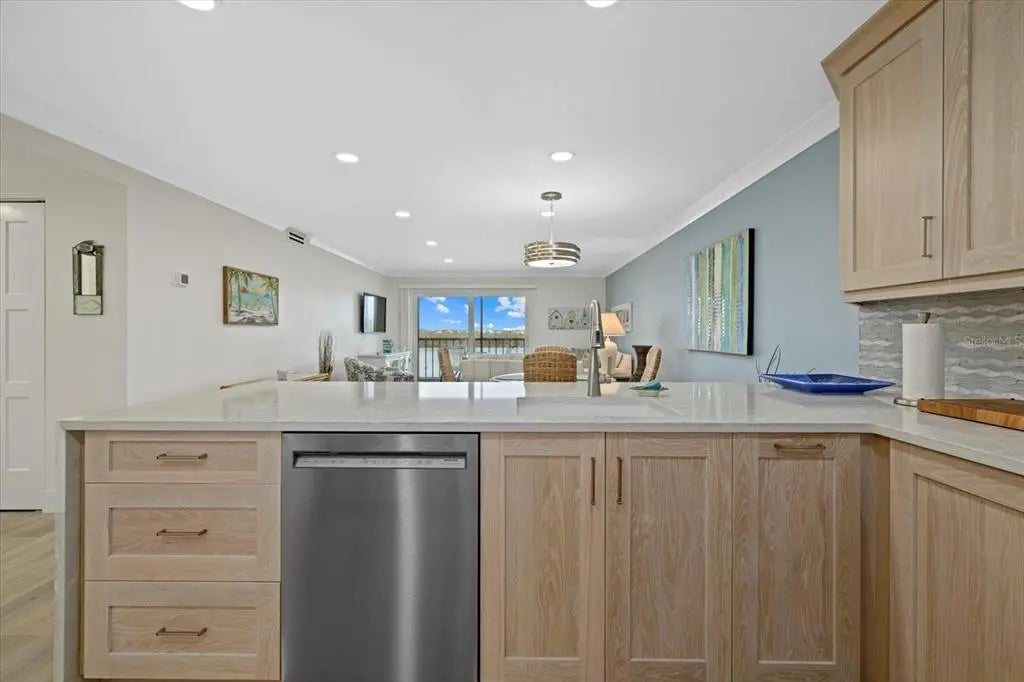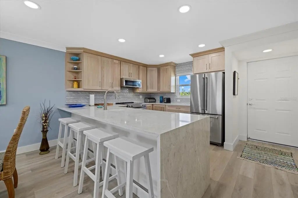 If you seek incredible views, look no further. Surrounded by water on three sides, enjoy the panoramic vistas on the southernmost end of Siesta Key. Look from the lanai to the east at scenic Neville Preserve and Little Sarasota Bay. The west-facing front of the unit is the perfect location from which to enjoy the spectacular Siesta Key sunsets with friends and neighbors. Step inside this beautifully updated turn-key furnished 2-bedroom, 2-bathroom unit and experience coastal elegance at its finest. The open-concept kitchen features stunning cabinetry, a quartz waterfall countertop, and sleek stainless steel appliances—ideal for entertaining or enjoying quiet mornings with a view. Crown molding and recessed lighting add a refined touch throughout the space. The master suite is a private retreat with a spacious bedroom, walk-in closet, and sliding doors leading to the lanai—offering peaceful water views to wake up to each morning. The en-suite master bathroom is a spa-like sanctuary, complete with a walk-in shower, quartz countertops, and a breathtaking tiled wall and shower. The second bathroom echoes this sophisticated design with quartz counters and beautifully tiled features. A large screened-in lanai invites you to unwind while soaking in the ever-changing hues of sunrise and sunset over the Intracoastal Waterway. Additional conveniences include an in-unit washer/dryer and an assigned covered parking space. A gated community, The Pointe is beautifully landscaped and features every amenity: a heated pool and spa, lighted tennis and pickleball courts, private boat docks, kayak and paddleboard racks and launch, exercise rooms, men's and women's saunas, clubhouse, a private island with a gazebo and grills, and on-site management and maintenance. This five-plus-acre property is conveniently located just a few minutes’ walk from Turtle Beach and three restaurants. Come live at the less-traveled, more tranquil end of the Key and enjoy the walking and bike paths under tree-lined Midnight Pass Road. Boat docks are available!!