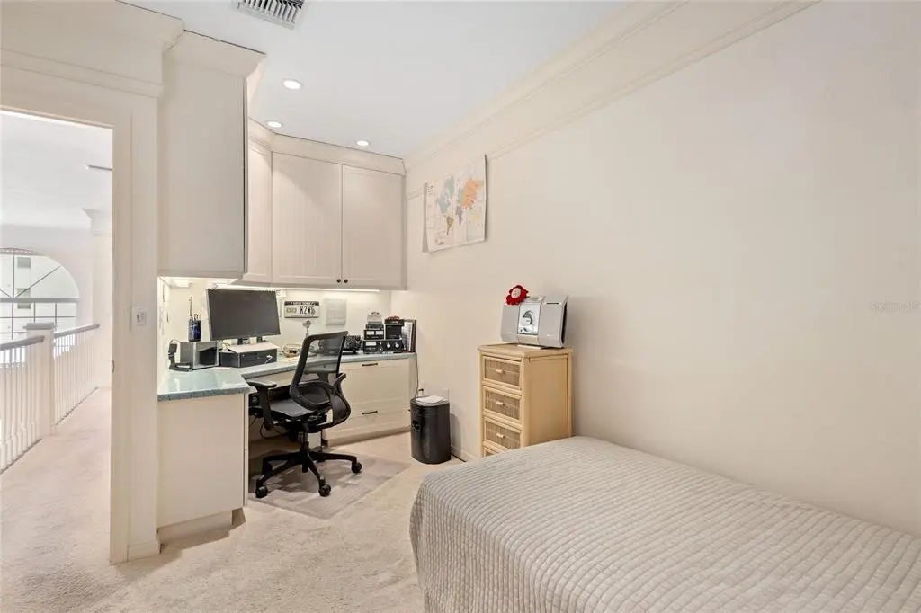 Welcome to coastal elegance and a rare opportunity to own one of only 27 townhomes in the highly sought-after Coquille community, nestled on the picturesque barrier island of Siesta Key, where you are steps to having your feet in the famous soft, white quartz sand that makes Siesta Beach famous. This spacious and light-filled, furnished 2-bedroom, 2-bathroom residence also includes a Florida room and an enclosed study that can easily function as a third bedroom, offering over 1,760 square feet of refined, maintenance-free living in an intimate, boutique townhome complex. Inside, soaring 17-foot ceilings and clerestory windows flood the open living space with natural light, creating a bright and airy atmosphere perfect for relaxing or entertaining. The kitchen features classic white cabinetry, granite countertops, and stainless steel KitchenAid appliances, all seamlessly integrated with the dining and living areas to offer a cohesive and functional layout. The main-level primary suite includes direct access to the enclosed lanai Florida room and a vestibule with both walk-in and reach-in closets that lead to the primary bathroom, complete with a new stacked washer and dryer for added convenience. Upstairs, a generous 15x13 guest bedroom includes a reach-in closet and is complemented by a hallway with both walk-in and linen closets. The beautifully renovated coastal-style bathroom features a soaking tub and shower combination, while an enclosed loft area currently serves as a third bedroom with a built-in set of drawers and a home office with built-in desk and cabinetry. Additional storage under the stairs, custom built-in drawers along the living room wall, and a private 7x7 storage room downstairs in the garage give you the space and feel of single family home living. The oversized, tandem garage located directly beneath the residence accommodates 2 to 3 vehicles and includes a designated grill area. The property also features electric hurricane shutters for peace of mind. Recent updates and ongoing community enhancements further elevate the value of this home. A new roof has just been completed, and the community is undergoing a stunning transformation scheduled for completion by year-end. Improvements include new exterior paint (Sherwin-Williams Alabaster on walls and Sherwin-Williams Underseas on the shutters and front doors), new garage doors (Sherwin-Williams Urbane Bronze), new modern exterior lighting, new fencing, and refreshed landscaping. The current owner has also ordered a new front door to be installed for this unit. Additional system upgrades include a 2019/2024 HVAC system and a 2024 electric tankless water heater. Outside, enjoy the best of the Siesta Key lifestyle with a private boardwalk leading directly to the beach, complete with chairs and chaise lounges for residents. The community also features a recently refinished 36x19 pool and spa area, along with an outdoor shower and restrooms. Coquille is pet-friendly and ideally located just a short walk or drive to the vibrant dining, shopping, and energy of Siesta Village.
