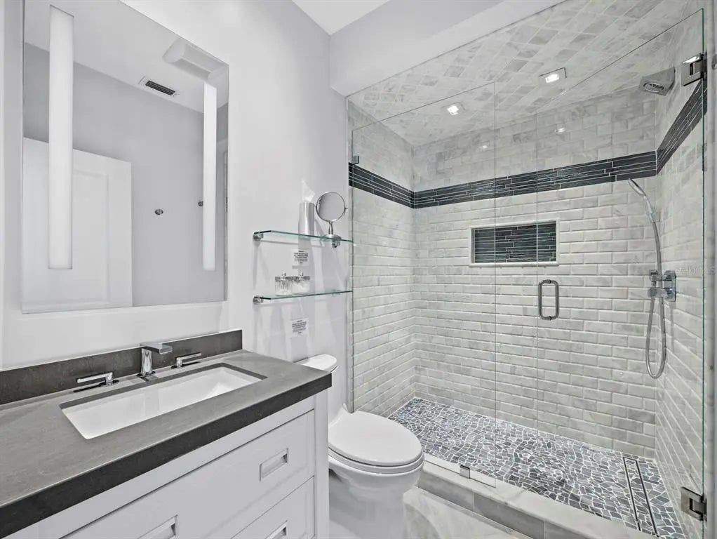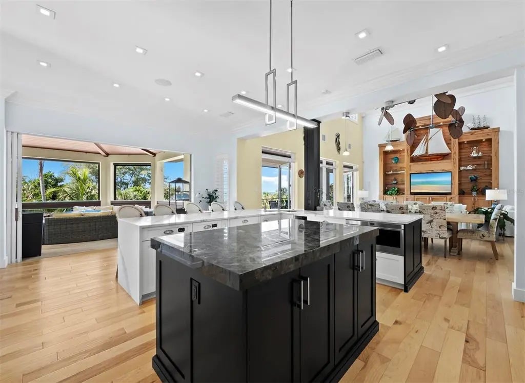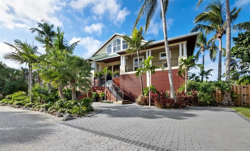 Welcome to this extraordinary Gulf-front estate located in one of Siesta Key’s most exclusive enclaves. Situated on a full acre in the private Sandy Hook community, this fully renovated, turnkey residence offers over 5,000 square feet of refined living space and more than 3,000 square feet of covered outdoor areas, all just a short stroll from Siesta Key Village and with direct access to a private community beach. Inside, the layout features five en-suite bedrooms, two powder baths, a dedicated office, and a three-car garage with beach cruisers and kayaks included. Floor-to-ceiling Andersen impact windows frame panoramic Gulf views, while rich finishes like Sapele mahogany siding, IPE hardwood decking, and a custom Pecky Cypress entertainment system reflect the home’s elevated craftsmanship. The chef’s kitchen is a showpiece, centered around a Labradorite Lumarian Blue granite island imported from Brazil, with Wolf, Miele, and Sub-Zero appliances throughout. The spa-inspired primary suite includes a waterfall feature wall, dual curbless shower, lighted soaking tub, and Toto smart toilets. A private elevator and full smart-home system ensure ease and efficiency. Outdoor living is exceptional, with a heated saltwater pool and Jacuzzi, a fully equipped summer kitchen, a covered outdoor living room with fireplace and TV, a poolside theater with dual fireplaces and TVs, and a sunset-facing gas fire pit. The professionally designed $1M+ tropical landscape includes advanced mosquito-misting and irrigation systems for effortless maintenance. With direct access to a private, resident-only beach and an ideal location just minutes from restaurants, shopping, and entertainment, this one-of-a-kind estate offers a rare opportunity to experience the best of coastal living on Siesta Key. Designed for elevated living and effortless enjoyment, 26 Sandy Hook Road S is more than a home—it is a fully realized Gulf-front sanctuary.