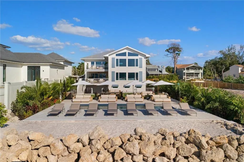Experience private beachfront coastal luxury at this one-of-one Siesta Key home, thoughtfully curated for comfort, style, and entertainment - by Pham Development. Perfectly positioned off the Gulf, with gorgeous ocean views throughout the rooms - you can watch a world-class sunset view from your master bedroom. Spanning over 6,468 square feet under air and 9,080 total square feet, this exquisite residence captures the essence of resort-style waterfront living on more than half an acre of pristine Gulf-front land. Be at ease with a surrounding elevated riprap shoreline and the imported rocks, offering both protection and privacy. Pull into the property through the gated entry, with a paved driveway for ample parking. The ground level offers a 3-car garage, spacious private fitness studio with AC, large flex space/storage room, and huge game room that leads out to the truly special backyard - with premium turf, silica sand and a putting area. Host a sunset dinner with the full outdoor kitchen, including a freezer, wet bar, beverage center, ice machine, and 6-burner grill. Have a drink while sitting in the pool facing the ocean, relax in the champagne spa hot tub, or tan on the sun shelf. Put your toes in the sand area of the backyard, or take the paver steps down to the private beach and swim in the ocean - the ultimate paradise. Wake up to the panoramic views of the Gulf of America and Sarasota Bay, that create a daily masterpiece of color and light, and have a coffee on the master bedroom's private balcony. With 6 bedrooms, 5 full bathrooms, and 2 half baths, you can host more family and guests - along with the second living room/media room. All of the bedrooms have custom built-in closets, and the spacious ocean-view master bathroom leads to two spacious walk-in closets. The home features high-ceilings, beautiful hardwood flooring throughout, and cypress beams. The living and dining room area have a fireplace, and the open-floor plan leads out to another large balcony overlooking the ocean. Enjoy the gourmet custom kitchen with Thermador gas appliances, a walk-in pantry, and an extra large quartz island with seating. An elevator connects the 3-level home through the grand living spaces that flow seamlessly toward the water, blending indoor sophistication with the beauty of the coast. The lush tropical landscaping evokes the serenity of a private resort. Located just minutes from Siesta Beach, the Village, and the North Siesta Bridge, this rare coastal jewel offers the ultimate combination of elegance, exclusivity, and Gulf-front tranquility—a move-in ready residence truly without equal on Siesta Key. Please go to our Youtube link and see the video of this gorgeous property: https://youtu.be/qv5Iljf5d5U?si=dTNKY3LAuFQH6xBc