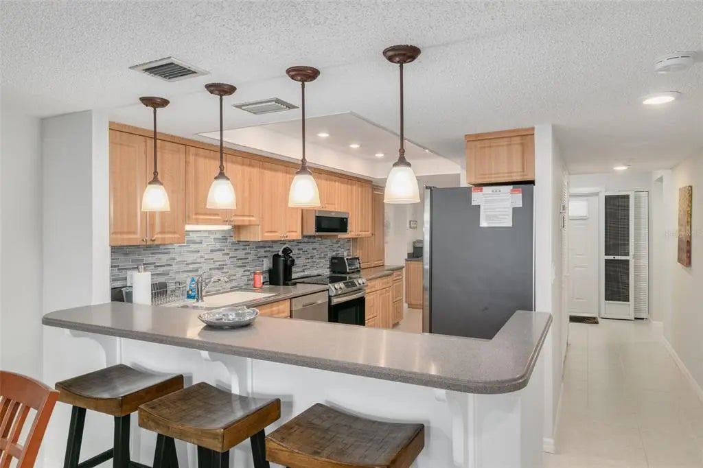 Motivated sellers! Sellers will consider financing. Turtle Bay community has a 3-month minimum rental policy. Experience the best of Siesta Key in this beautifully unfurnished 2BR/2BA condo in the highly desirable Turtle Bay community. Enjoy breathtaking views of Little Sarasota Bay from the enclosed, screened lanai, ideal for relaxing mornings or evening breezes. The remodeled kitchen features stainless steel appliances, updated quartz countertops, and a breakfast bar that opens into the spacious, open-concept living and dining area, perfect for entertaining. The primary suite offers an updated en-suite bathroom, walk-in closet, and built-in vanity. The generously sized second bedroom is perfect for guests or a home office. Additional conveniences include an in-unit laundry room. Recent updates include a 2023 2.5-ton Trane HVAC unit, renovated bathrooms, LED recessed lighting, and popcorn ceiling removed. A rare 12x22 detached end-unit garage provides excellent storage for your vehicle, bikes, or beach and boating gear. Turtle Bay offers resort-style amenities, including a heated pool, hot tub, clubhouse, onsite management, tennis and pickleball courts, lush landscaping, newly updated fishing pier, and boat docks - boat slips are available for nominal fee on a first-come, first-served basis. Milestone Inspection has been completed for the new owner's piece of mind. Enjoy easy access to the sparkling Gulf of Mexico waters with deeded beach access just across the street via the Tortuga Community. Conveniently close to Siesta Key Village and Siesta Key Public Beach via the free trolley stop just steps away. Coastal living at its finest! Schedule your showing today!