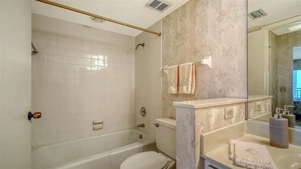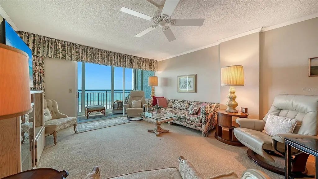 Experience breathtaking, 180 degree FULL GULF VIEWS from this 8th floor North Tower residence overlooking 800’ of private beach in the premiere Gulf front property of Whispering Sands! Priced to sell, this 2 bedroom/2 bath, upper floor unit represents an exceptional investment opportunity in one of Siesta Key’s most sought after communities. It could be considered a blank slate, offering the new owner the opportunity to use their imagination and create a retreat that reflects their own personal style. A 25' private balcony, accessible via floor to ceiling sliders opening from the living room and primary bedroom, offers panoramic vistas across the shimmering shoreline and powder soft sands and a lifetime of spectacular symphonies of colorful sunsets over the Gulf. A complete set of NEW 2024 hurricane impact exterior balcony sliders provides total peace of mind. The galley kitchen includes a nice eat-in space and Bosch, Whirlpool, and Frigidaire appliances. The primary bedroom features an ensuite bath with tub/shower combination, walk-in closet, and generous vanity area. The guest bedroom is large enough to accommodate two queen beds – or would easily make a great home office or den. The furniture and furnishings minus a small exclusion list are being offered with this property. Residents of Whispering Sands enjoy resort style amenities, including 2 heated pools, 800’ of private beach, clubhouse and Gulf front Tower Lounge – both of which are currently in the process of being completely remodeled – NEW beachside gas grills, Tiki Hut, shuffleboard, and canoe/kayak storage. Beach loungers are put out daily for the exclusive use of owners and their guests. Leave your car at home: all of this is conveniently just around the corner from the myriad of dining options, colorful boutiques, and vibrant island lifestyle of Siesta Key Village! Seize this opportunity to create a lifetime of memories by investing in one of Siesta Key’s most desirable Gulf front communities.