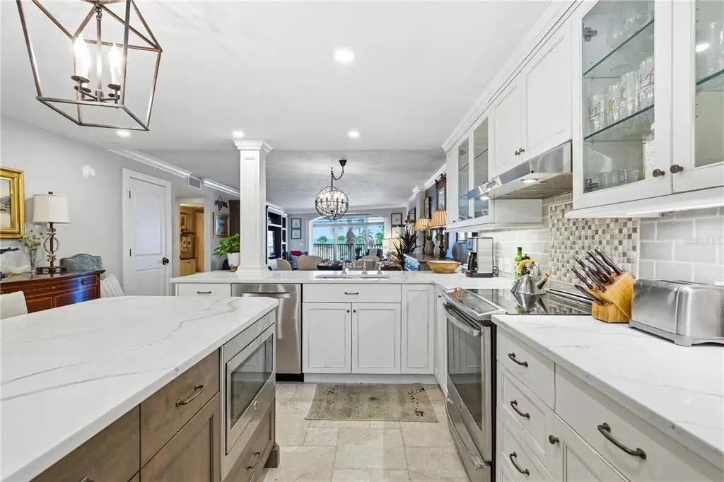 Welcome to Casarina, one of Siesta Key’s most beautifully updated beachfront communities—and a place that truly captures the best of coastal living. This beautifully renewed 2-bed, 2-bath residence in Unit 302 blends comfort, quality, and a relaxed island feel from the moment you walk in. The entry opens to a light-filled space accented with custom built-in shelving, detailed mouldings, and upgraded luxury lighting that makes the home feel warm and inviting. The enclosed lanai adds valuable living space and creates a bright, peaceful spot to unwind with your morning coffee or enjoy quiet evenings after a day on the beach. The kitchen is refined and functional with modern updates, under-cabinet lighting, and a smooth flow into the dining and living areas—perfect for easy everyday living or hosting guests. The primary suite offers a calm retreat with a renovated bath and generous closet space, while the guest bedroom provides comfort and privacy for visitors. You’ll also appreciate the in-unit laundry with additional storage space. Casarina offers a true resort-style experience across 7 acres of lush, tropical landscaping. The entire property has been thoughtfully reimagined to elevate outdoor living. Generous in size, the pool offers ample room for both lap-style swimming and relaxed lounging, all set just steps from the sand. The surrounding oversized sun deck provides abundant seating, shaded areas, and open spaces to soak in the Florida sunshine. Residents enjoy pickleball and tennis courts, a grilling pavilion with outdoor kitchen space, and private pathways that lead to the community’s deeded Crescent Beach access—one of the most pristine stretches on Siesta Key. The building features secure key-fob entry, a sleek glass elevator, and impeccably maintained grounds that create a peaceful, upscale coastal environment. A rare private garage space, highly coveted in beachfront communities, adds exceptional convenience and value. Living in Casarina means embracing a laid-back coastal lifestyle where every day feels like a getaway. Enjoy morning beach walks on powder-soft quartz sand, sunset dinners at waterfront restaurants, and a vibrant local scene filled with boutique shops, live music, and outdoor recreation. With its welcoming community and effortless blend of luxury and leisure, Casarina offers a lifestyle that truly feels exceptional.