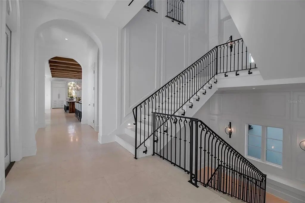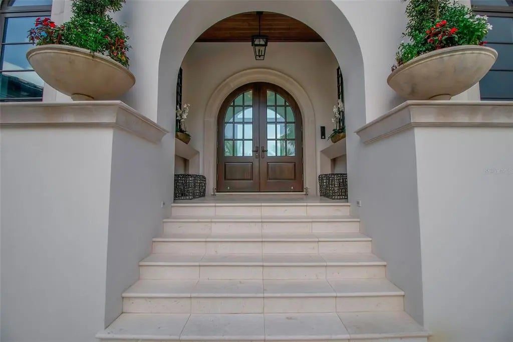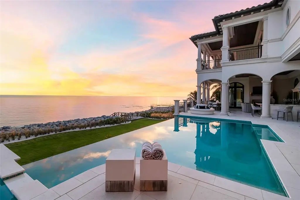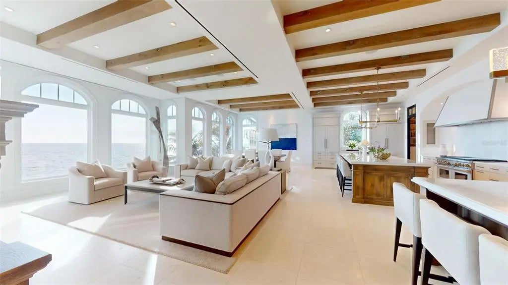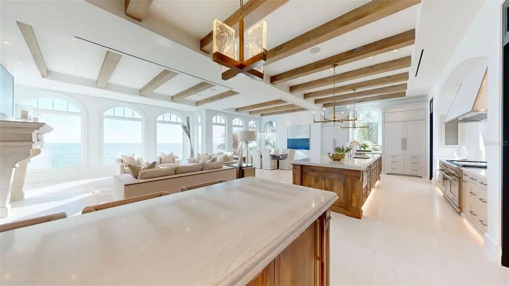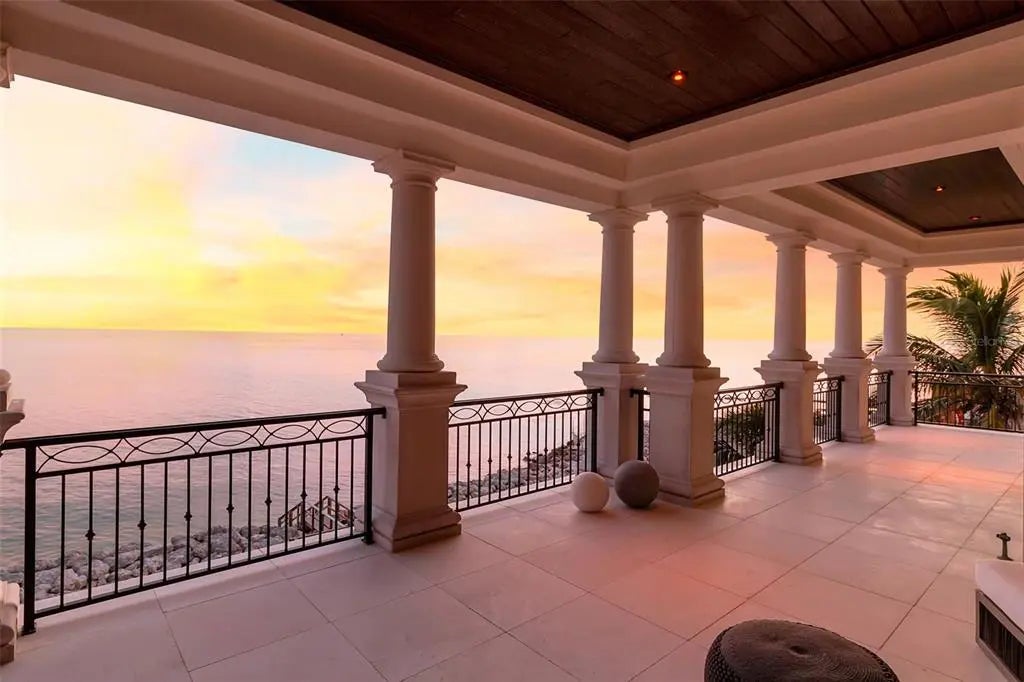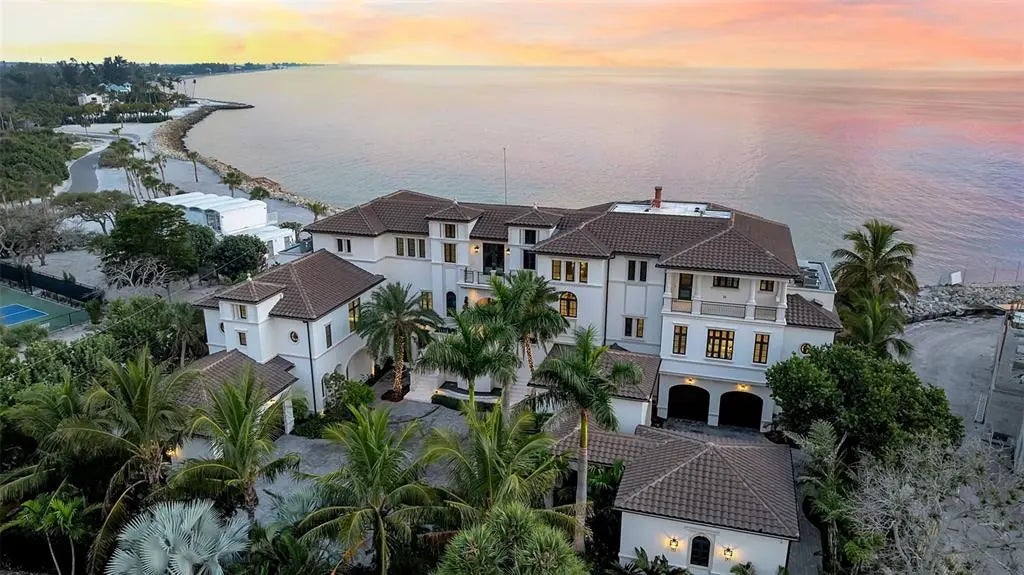Rising above an enviable stretch of shoreline, this Gulf-front estate showcases timeless architecture and coastal refinement. Designed by CMSA Architects and completed in 2020, the residence features layered rooflines, sculpted stone staircases, and soaring arched windows across more than 180 feet of Gulf frontage. With 10,600 square feet of interiors and 20,982 square feet in total, the home offers a grand yet effortless indoor–outdoor lifestyle, ideal for both elevated entertaining and daily living. A sweeping motor court, mature palms, and a grand double staircase create an immediate sense of arrival. Inside, natural light and uninterrupted Gulf vistas establish a feeling of calm, scale, and sophistication from sunrise to sunset. The great room, lined with floor-to-ceiling arched windows and anchored by a carved-stone fireplace, delivers both serenity and architectural presence. The main kitchen is a triumph of craftsmanship - featuring custom Campbell cabinetry, quartz countertops, designer lighting, Sub-Zero refrigeration, a Wolf six-burner dual-oven range, and a substantial island that anchors the open flow into the living and dining spaces. A prep kitchen and workspace elevate functionality with premium appliances, expansive storage, quartz counters, and a dedicated gift-wrapping wall. The bar and wine room create a refined entertaining destination, defined by custom cabinetry and designer lighting. An iron-and-glass–enclosed, temperature-controlled wine room serves as the focal point, complemented by adjacent illuminated display shelving. Sub-Zero refrigeration, an ice maker, and a Fisher & Paykel dishwasher drawer complete the space. Outdoors, the estate unfolds across three dramatic tiers of Gulf-facing living, featuring arched loggias and a resort-style alfresco kitchen with a wraparound bar that opens seamlessly to the main living spaces. An elevated infinity-edge pool and spa appear to merge with the Gulf, while thoughtfully designed outdoor areas transition effortlessly to a manicured lawn and direct access to the crystal-clear waters at Point of Rocks—where snorkeling, dolphin sightings, and sunset walks become part of daily life. The primary suite forms a private wing, introduced by an illuminated groin-vault corridor that enhances the home’s architectural rhythm. Gulf views fill the bedroom and its terrace, while the bath offers a symmetrically designed retreat with dual vanities, full-height mirrors, multiple chandeliers, a massive double-entry shower, a stone-surround soaking tub, a Sub-Zero–equipped coffee bar, and two exceptional custom closets. Nearby, the office provides a quiet, light-filled workspace. The upper level is devoted to comfort and privacy, offering four well-appointed guest suites, a spacious family room with a wet bar, multiple terraces capturing Gulf views, an additional office, and a laundry room. The ground level is enhanced by indoor–outdoor walkways connecting multiple spaces and generous storage, reinforcing the effortless, resort-style livability. A generator, 3-stop elevator, 6-plus humidity-controlled garage spaces, floor-to-ceiling shades, linear vents, whole-house automation, and shellstone and French oak flooring complete the offering. A short, shaded, tree-lined walk places you at Siesta Key Beach, the No. 1 beach in America by TripAdvisor, offering effortless access to one of the world’s most iconic shorelines.