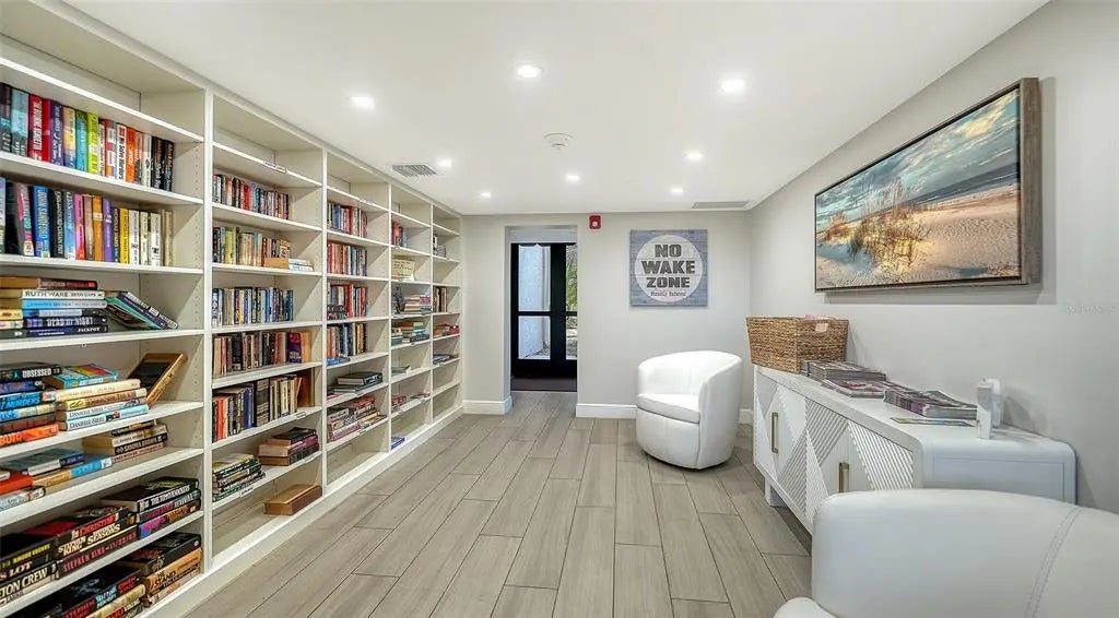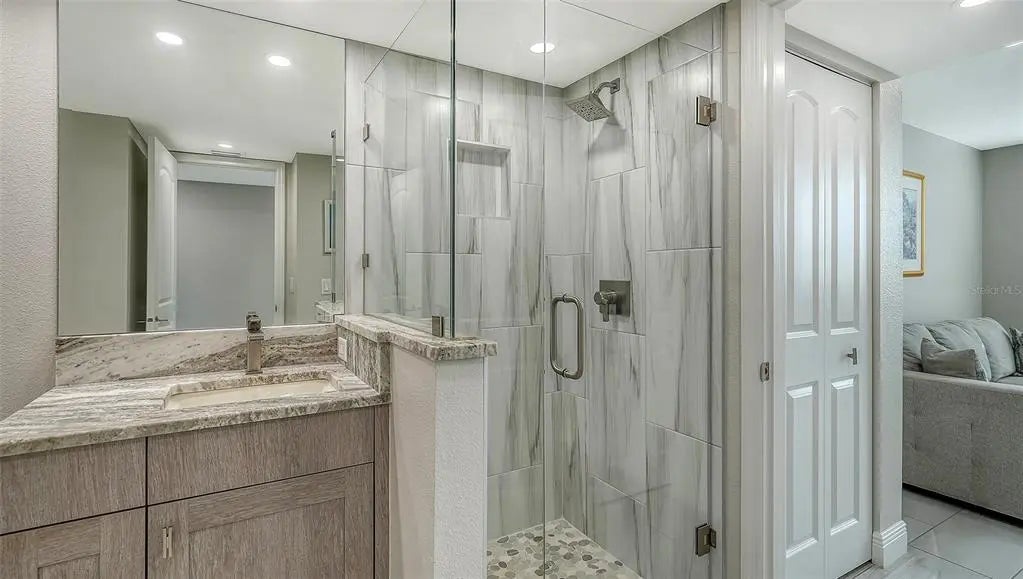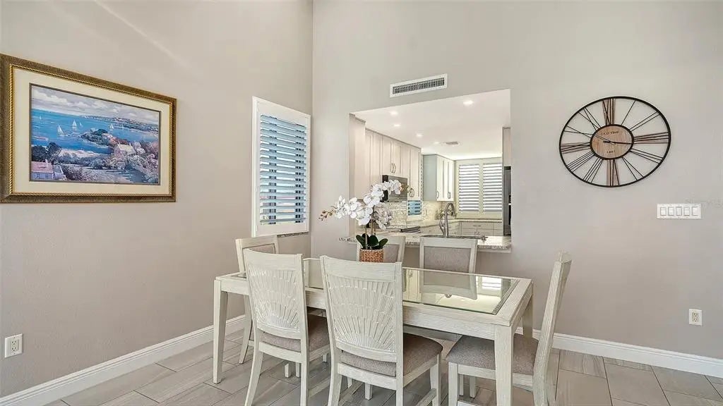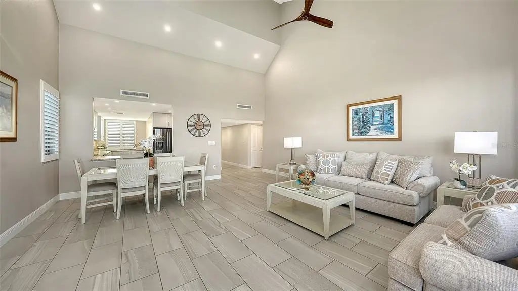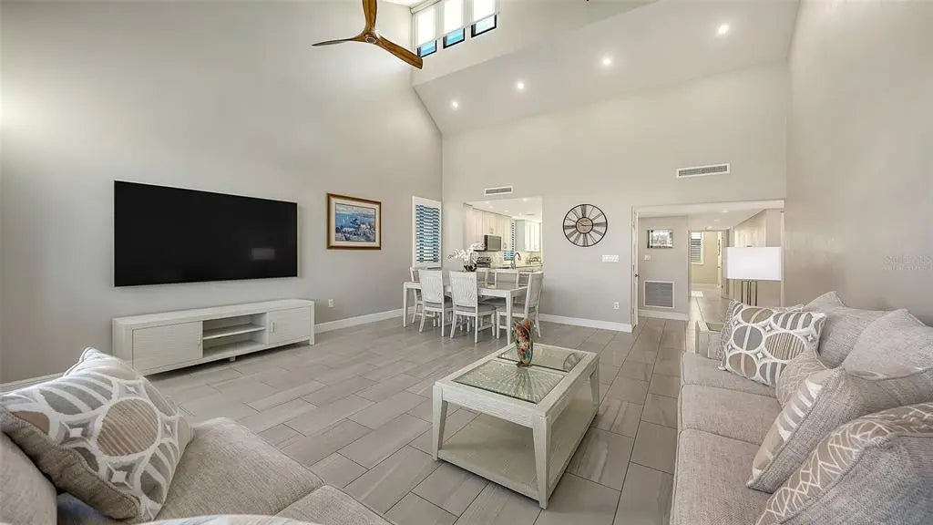 Located in the desirable Excelsior Beach-to-Bay community, this beautifully and completely renovated top-floor end unit condominium is a peaceful coastal-inspired home defined by soaring cathedral ceilings, natural light, and designer finishes! Enjoy the private deeded access to the powder-soft sands of world-famous Crescent Beach on Siesta Key, the azure, blue waters of the Gulf of Mexico and the lush park-like grounds with mature oaks, flowing fountains, and tranquil courtyard ponds. Walk into the heart of the home which encompasses the open living and dining room, where soaring 23 ft ceilings create an airy, open ambiance. The expanded and enclosed lanai adds approximately 200 square ft of additional ac space, framed by floor-to-ceiling windows that span 30 ft and capture peaceful garden views and fill the home with soft, natural light. The kitchen, designed for both cooking and gathering, is open to the dining room and features Divitori soft-close dovetail cabinetry, pull-out drawers, two generous pantries with pull out storage, level-four matching granite counters, under-cabinet dimmable lighting, and abundant extra cabinet storage—all illuminated by recessed LED lighting. Enter the primary suite, complete with dramatic 12 ft ceiling, spacious walk-in closet with custom Container Store built-ins, and a beautifully finished bath with granite, tile, and a large glass walk-in shower. The suite feels peaceful and secluded, with lovely natural light enhancing the room’s sense of openness. The guest bedroom offers excellent privacy and comfort with plentiful closet space, plantation shutters, and convenient access to a full bath appointed with granite counters, and a glass walk-in shower. Tile flooring flows throughout, complemented by recessed LED lighting on dimmers, plantation shutters, aviation-style ceiling fans, and updated hurricane-rated windows in all areas other than the lanai. Benefit from the unit’s flexible layout, including the potential to expand into a third bedroom and bath. The all-new furnishings package makes move-in easy and can be purchased separately. Additional conveniences include in-unit laundry, new tankless water heater (2025), and new AC (2025). Enjoyment is unmatched in this beautifully landscaped, resort-style beach-to-bay community where residents and guests alike relax beneath mature live oaks, stroll past flowering gardens and ponds, and unwind at your private beach with lounge chairs or at either of Excelsior’s 2 heated pools and spas—one on the Bayfront and one on the Gulf side. Covered grilling areas, a bayside fishing pier, shaded seating, and effortless access to both the Intracoastal and the private white-sand beach create the quintessential Siesta Key lifestyle. Spanning several pristine acres, Excelsior is a well-managed condominium with strong reserves and on-site manger and offers an exceptional array of amenities, including a newly rebuilt fitness center, renovated elevators and community room (2025), 4 pickleball courts, a tennis court, shuffleboard, a clubhouse, secure parking with 2 parking spaces (1 assigned under building, 1 unassigned carport space). Perfectly positioned between Siesta Village and South Siesta’s dining and shopping, the community blends natural beauty, convenience, and coastal sophistication, delivering a truly luxurious island retreat. This is Island living as it's meant to be!