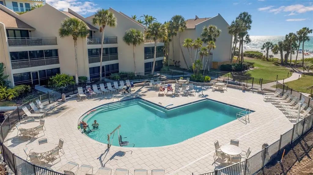 Experience effortless beachfront living from this turnkey-furnished, second-floor condominium with elevator access and sweeping views of the turquoise waters of the Gulf of Mexico and the newly updated pool area. Enjoy morning coffee to the sound of the surf and spectacular sunsets with uninterrupted shoreline views. BEST OF ALL - THIS UNIT SUSTAINED NO HURRICANE DAMAGE! Located at Midnight Cove, a highly sought-after gulf-to-bay community on Crescent Beach, this spacious 2-bedroom, 2-bath residence offers a welcoming coastal-style foyer and an open, updated kitchen with white cabinetry, solid surface counters, closet pantry and a breakfast bar with seating for four. The living and dining areas open to a screened lanai featuring chaise lounges, a dining table, and bar counter—perfect for relaxed indoor-outdoor living. The primary suite includes a large walk-in closet and an updated ensuite bath with new cabinetry, countertops, fixtures, and a glass-enclosed shower. A separate in-unit laundry room provides added storage, while the guest bedroom and second bath comfortably accommodate family and friends. Designed for low-maintenance living, Midnight Cove offers resort-style amenities including two pools, private beach access, tennis courts, boat dockage, fitness room, barbecue areas, and gated entry. An onsite, professionally managed rental office makes ownership effortless, with many repeat guests and strong rental demand. Ideally located just minutes from Siesta Key Village’s shops and dining, and within easy reach of Sarasota-Bradenton International Airport and Tampa International Airport, this property is perfect as a primary residence, vacation home, or income-producing investment. Extensive rental history available. Ideal for a 1031 exchange.