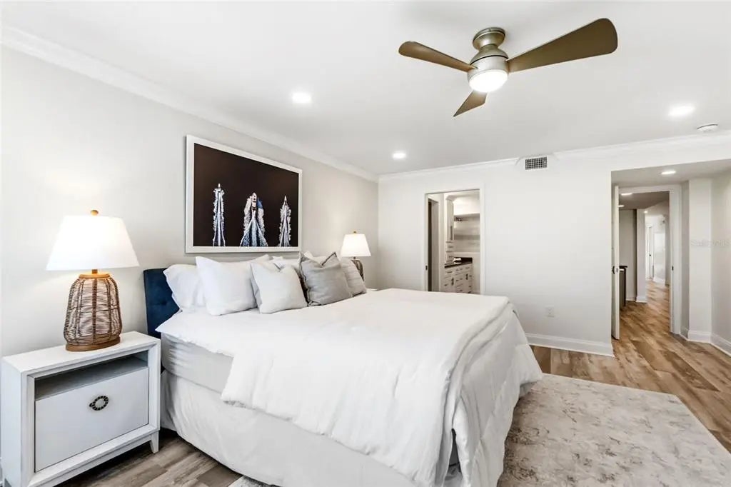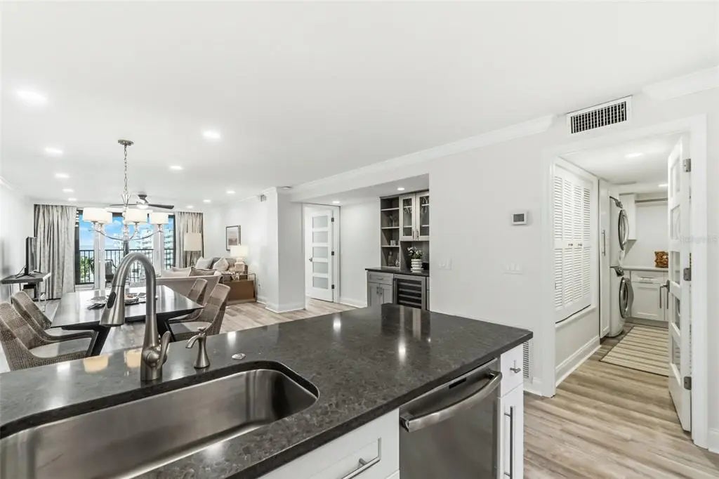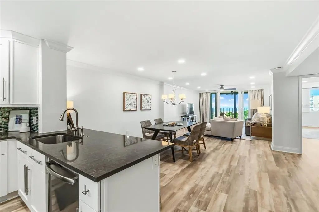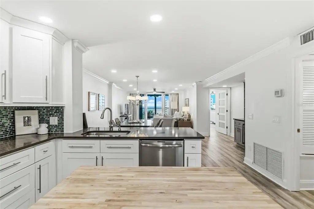 Wake each morning to the soothing rhythm of the sea in this stunning gulf-front condominium, where glorious, unobstructed views sweep across lushly manicured grounds, the shimmering pool, powder-soft beach, and the sparkling waters of the Gulf. This beautifully remodeled three-bedroom residence and two baths has been completely re-imagined, taken down to the studs and rebuilt from floor to ceiling with refined finishes and thoughtful design. The open-concept layout is anchored by a chef-inspired kitchen featuring a generous island, wood cabinetry, a stylish designer backsplash, gleaming granite countertops, and stainless steel appliances, all flowing seamlessly into the living area where breathtaking water views steal the show. Designed for both elegance and ease, the home also offers inside laundry with extra storage, making everyday living as effortless as it is luxurious. Whether you're entertaining guests against a sunset backdrop or savoring quiet mornings gazing at the Gulf, this condo delivers coastal living at its most captivating.