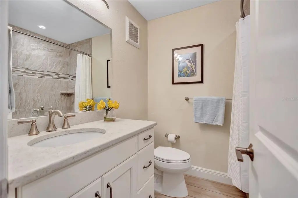 Discover this beautiful upstairs furnished condo in a highly desirable complex that is ideally situated in the Mira Mar neighborhood adjacent to the Siesta Key Village! Just a short stroll to the beach and mere moments from top dining, shopping, and nightlife, this unit is the ultimate coastal escape. Enjoy worry-free living with impact windows and sliding doors, a 2024 washer/dryer in the unit, and a 2022 water heater. NEW ROOF, no assessments, and no flooding concerns make this an exceptional find! Both the bathrooms and the kitchen have been tastefully renovated with sleek quartz countertops. The entire unit features neutral ceramic plank-tile flooring and a cohesive neutral palette throughout. Unwind on your screened in lanai, enveloped by lush palms and tropical greenery. Leave your car at home and soak in the beauty of Siesta Key Beach—ranked the #1 beach in the U.S. You are just 2/10 of a mile away from Sunset Pier where pristine white quartz sand, crystal-clear waters, and breathtaking sunsets await. Whether you're seeking a primary residence or the perfect island getaway, this beautifully maintained boutique community of just 16 condos offers an unbeatable location. Don’t miss this rare opportunity!