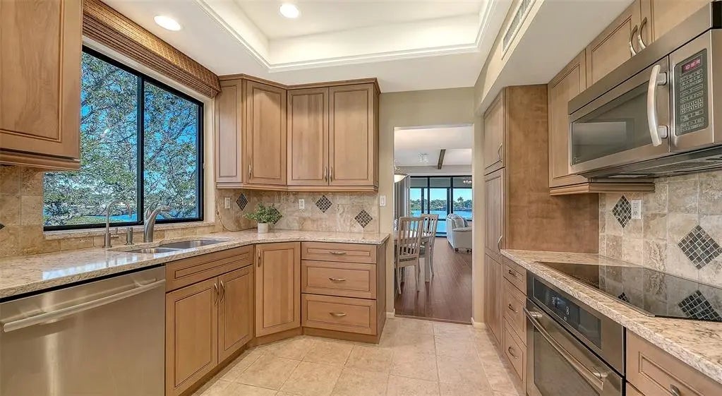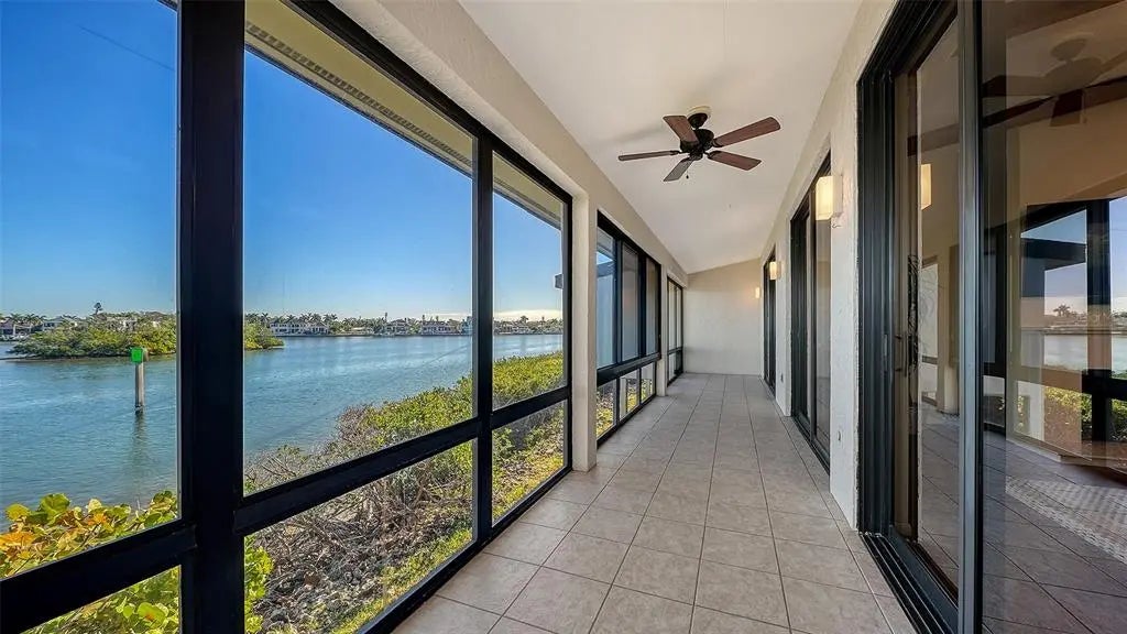 Offered for the first time, this rare three-bedroom, three-bath waterfront villa at Excelsior’s coveted Beach-to-Bay community presents an exceptional opportunity to own one of only eight residences of its kind. Positioned at end of the property along the Intracoastal Waterway, the villa enjoys extraordinary privacy, peacefulness, and sweeping 180-degree water views from the expansive 36-foot lanai and most principal rooms. This light-filled corner residence lives beautifully like a single-family home, elevated above a private two-car garage and framed by windows on three sides. The open floor plan is spacious and airy, enhanced by vaulted ceilings in the living room, primary suite, and guest bedroom, hardwood flooring, and sliding glass doors that invite the waterfront setting indoors. A wood-burning fireplace adds warmth and character, while ceiling fans, custom window treatments, and 3M hurricane film on windows provide comfort and peace of mind. The updated kitchen opens seamlessly to the main living areas, creating an ideal space for entertaining or relaxed island living. The primary suite features a walk-in closet, walk-in shower and updated bath. A new HVAC system, in-residence washer and dryer, and thoughtful upgrades throughout add to the villa’s move-in-ready appeal. Excelsior’s villas are uniquely situated directly on Sarasota Bay’s Intracoastal Waterway, with no other residences between you and the water. Only eight villas exist in total, four three-bedroom residences and four two-bedroom villas, making this a limited opportunity. Residents of Excelsior enjoy an unparalleled resort lifestyle with deeded beach access to Siesta Key’s world-renowned white sands, turquoise Gulf waters and mango-colored sunsets. Amenities include two large, heated pools, two hot tubs, tennis and pickleball courts, shuffleboard, a fitness center, library, community room, and tranquil tree-lined walkways with ponds and fountains. The fishing and lounging pier, grilling areas and picnic spaces are just moments away. The community is pet-friendly (small dogs), offers easy access to South Bridge and a short distance to Crescent Village, with free trolley service to Siesta Village. With two-week minimum rental policy and on-site property management services available, the residence also offers attractive flexibility for seasonal or investment use. From morning experiences along the shoreline to breathtaking sunsets over the Gulf, every day on Siesta Key feels like a vacation. And when you're ready to explore beyond the island, downtown Sarasota is just a short drive away, offering world-class dining, arts and culture, including the Ringling Museum, Van Wezel Performing Arts Hall and St. Armands Circle. Rarely available and exceptionally positioned, this waterfront villa captures the best of Siesta Key living, privacy, views, resort amenities and effortless access from beach to bay.