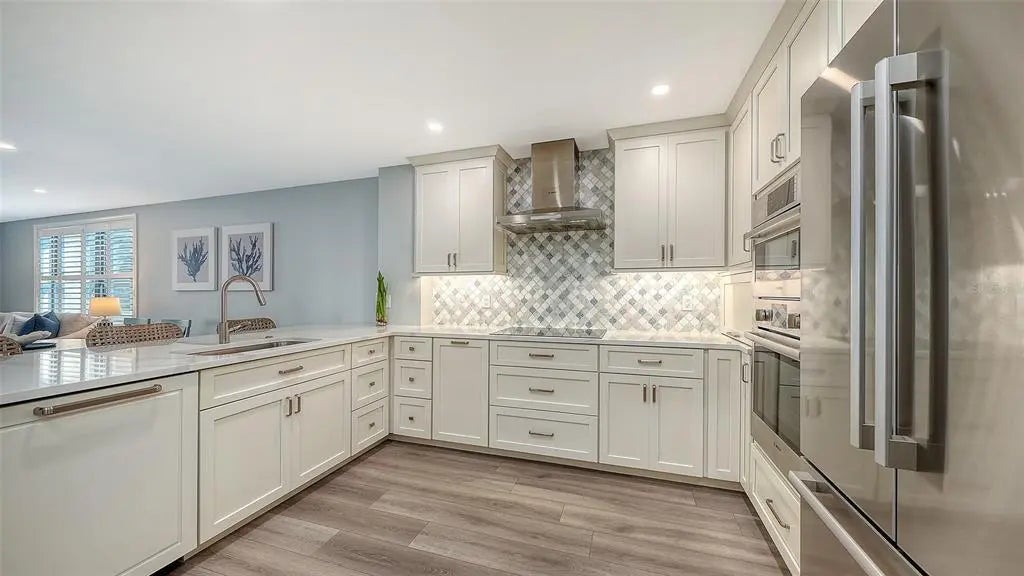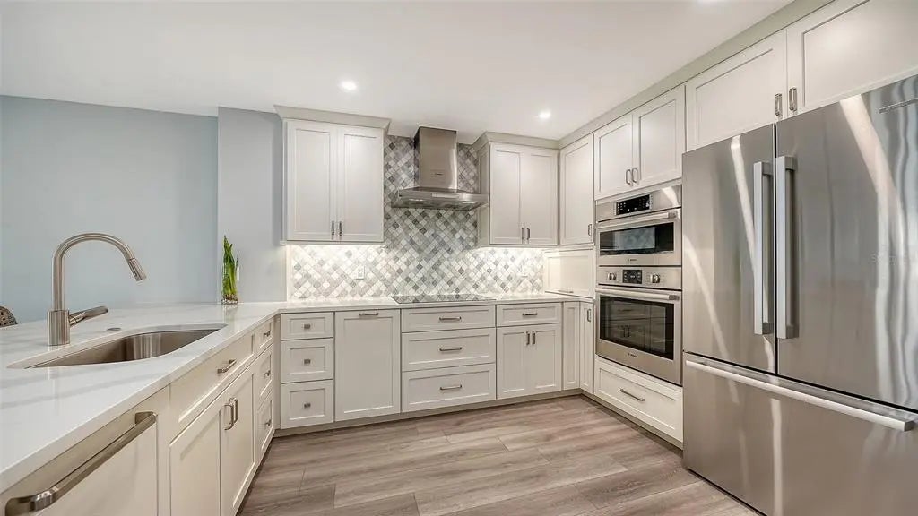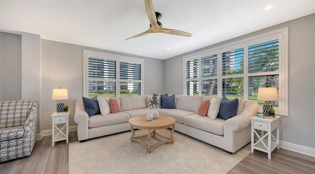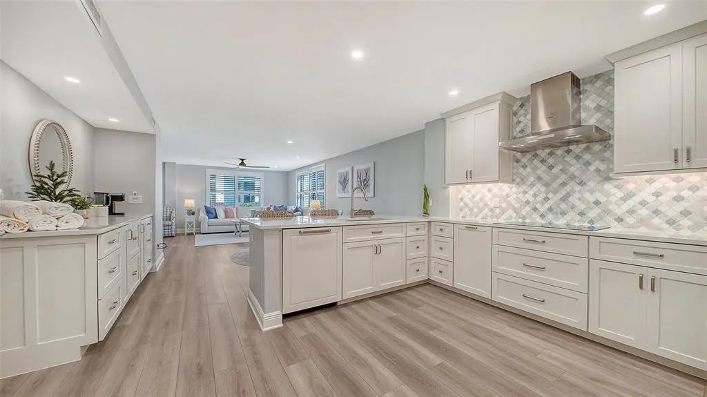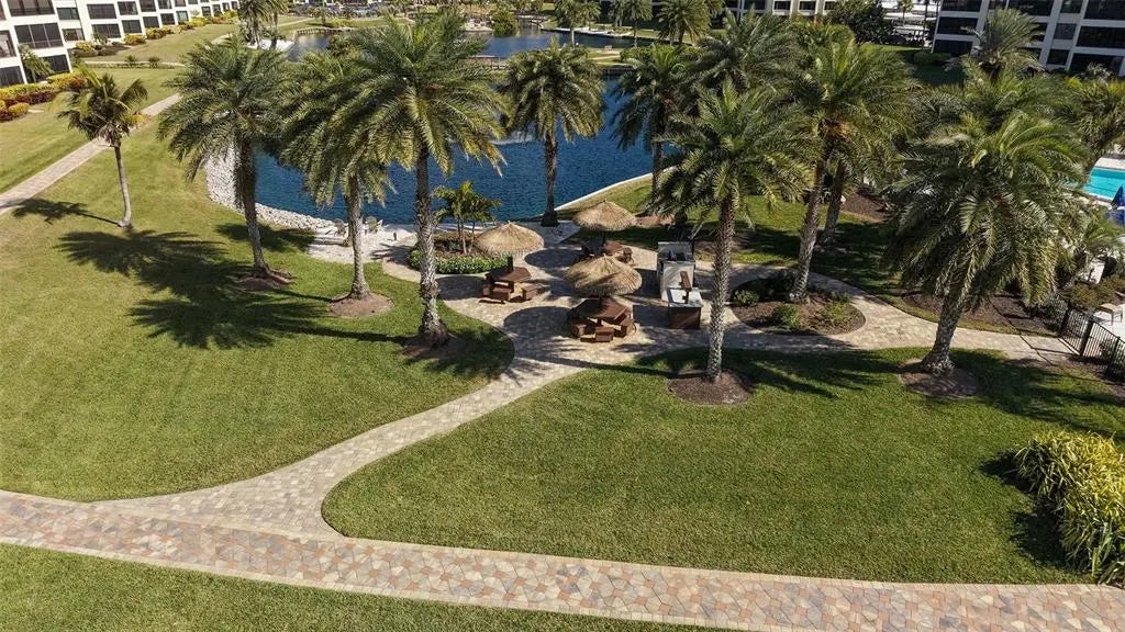 Welcome to the effortless rhythm of island living at Gulf & Bay Club, one of Siesta Key’s most prestigious beachfront communities. Behind the 24-hour guard-gated entrance, this beautifully remodeled, rarely available, three-bedroom residence offers the perfect blend of comfort, privacy, and resort-style living in a setting that feels worlds away from the everyday. Positioned on the first floor as a bright end unit, the home is surrounded by windows on three sides, filling the interior with natural light and creating a relaxed coastal atmosphere throughout. The thoughtfully redesigned floor plan opens beautifully for entertaining, with elegant finishes and carefully curated upgrades that make the residence feel both sophisticated and welcoming. The kitchen was designed with gathering in mind, featuring custom cabinetry, quartz countertops, marble backsplash, and premium Bosch appliances including induction cooktop and stainless vent hood. An additional built-in entertaining area with beverage refrigeration and extra storage makes hosting friends and family effortless. Living and dining areas flow naturally to the private lanai overlooking tropical landscaping and a tranquil lagoon, just steps to one of the community’s three pools, where evenings are often spent enjoying the peaceful surroundings and the soft glow of Siesta Key sunsets. The three-bedroom layout provides exceptional flexibility, whether for hosting guests, accommodating family, or creating a quiet home office. The primary suite offers a peaceful retreat with a walk-in closet and a beautifully updated bath featuring custom cabinetry, quartz countertops, and an expanded designer-tiled shower. Extensive renovations throughout the home include raised ceilings, smooth-finish walls, luxury flooring, updated lighting and electrical systems, new ductwork, upgraded panel box, air handler, and quick-recovery water heater. Importantly, the residence did not experience water intrusion during the recent hurricanes, offering additional peace of mind. Life at Gulf & Bay Club is defined by its resort-style amenities across 32 gated beachfront acres and 800 feet of Siesta Key’s famous quartz sand beach. Residents enjoy three heated pools including a lap pool, tennis and pickleball courts, racquetball, a large fitness center, beautifully landscaped walking paths surrounding the freshwater lagoon, clubhouses for gatherings, electric vehicle charging stations, and professional on-site management — all within a secure 24-hour guard-gated community. Just beyond the gates, the vibrant charm of Siesta Key Village awaits with its locally loved restaurants, boutiques, and island nightlife, while downtown Sarasota’s renowned arts and cultural scene is only a short drive away. This is more than a residence — it is an opportunity to experience the best of beachfront living on Siesta Key.