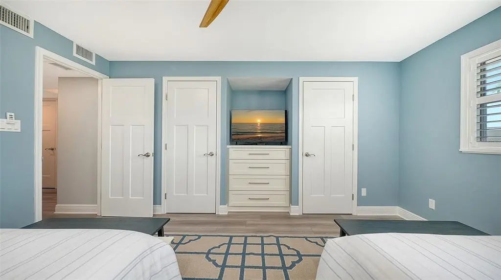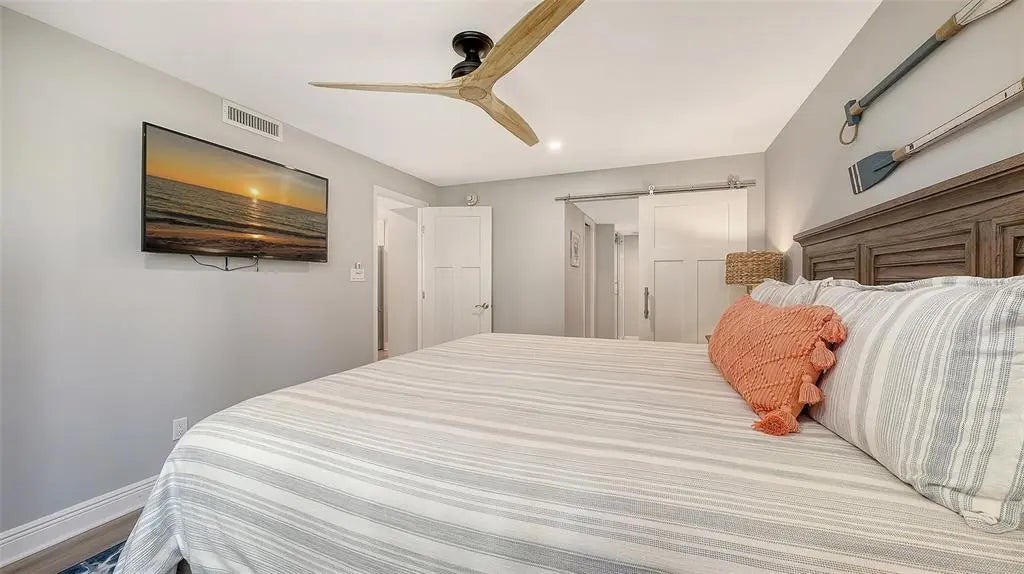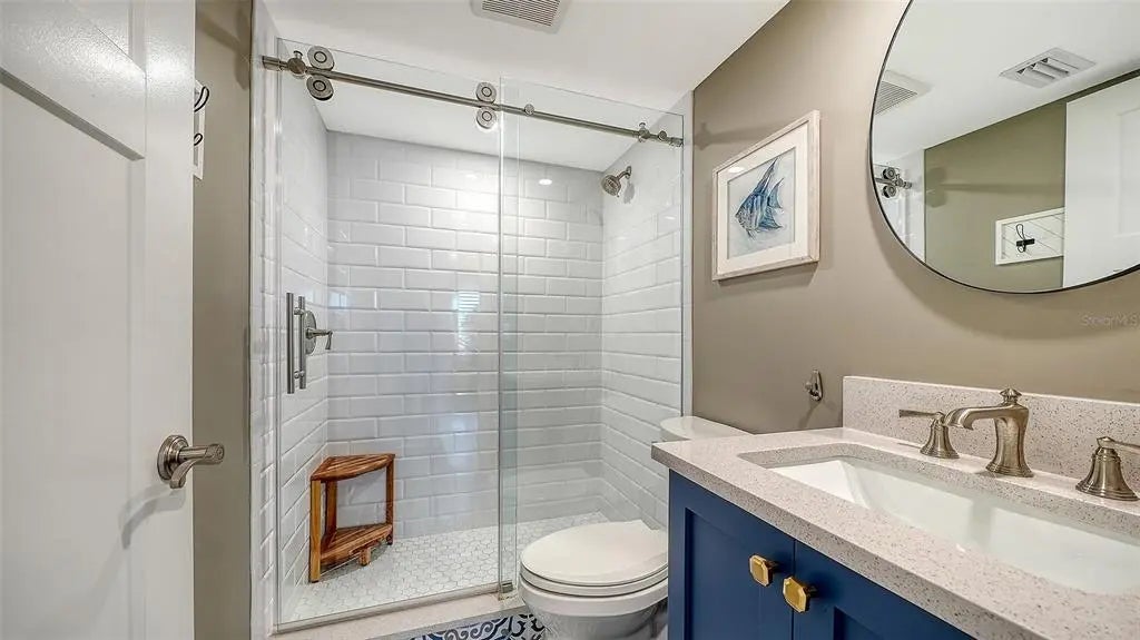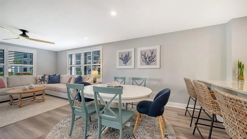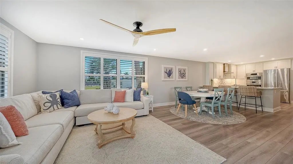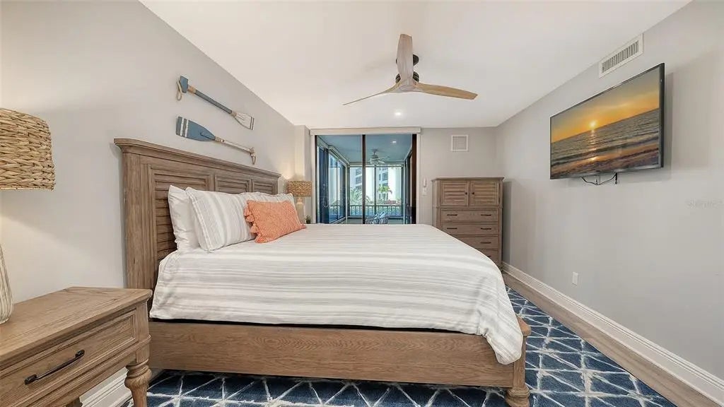 Welcome to the effortless rhythm of island living at Gulf & Bay Club, one of Siesta Key’s most prestigious beachfront communities. Behind the 24-hour guard-gated entrance, this beautifully remodeled, rarely available, three-bedroom residence offers the perfect blend of comfort, privacy, and resort-style living in a setting that feels worlds away from the everyday. Positioned on the first floor as a bright end unit, the home is surrounded by windows on three sides, filling the interior with natural light and creating a relaxed coastal atmosphere throughout. The thoughtfully redesigned floor plan opens beautifully for entertaining, with elegant finishes and carefully curated upgrades that make the residence feel both sophisticated and welcoming. The kitchen was designed with gathering in mind, featuring custom cabinetry, quartz countertops, marble backsplash, and premium Bosch appliances including induction cooktop and stainless vent hood. An additional built-in entertaining area with beverage refrigeration and extra storage makes hosting friends and family effortless. Living and dining areas flow naturally to the private lanai overlooking tropical landscaping and a tranquil lagoon, just steps to one of the community’s three pools, where evenings are often spent enjoying the peaceful surroundings and the soft glow of Siesta Key sunsets. The three-bedroom layout provides exceptional flexibility, whether for hosting guests, accommodating family, or creating a quiet home office. The primary suite offers a peaceful retreat with a walk-in closet and a beautifully updated bath featuring custom cabinetry, quartz countertops, and an expanded designer-tiled shower. Extensive renovations throughout the home include raised ceilings, smooth-finish walls, luxury flooring, updated lighting and electrical systems, new ductwork, upgraded panel box, air handler, and quick-recovery water heater. Importantly, the residence did not experience water intrusion during the recent hurricanes, offering additional peace of mind. Life at Gulf & Bay Club is defined by its resort-style amenities across 32 gated beachfront acres and 800 feet of Siesta Key’s famous quartz sand beach. Residents enjoy three heated pools including a lap pool, tennis and pickleball courts, racquetball, a large fitness center, beautifully landscaped walking paths surrounding the freshwater lagoon, clubhouses for gatherings, electric vehicle charging stations, and professional on-site management — all within a secure 24-hour guard-gated community. Just beyond the gates, the vibrant charm of Siesta Key Village awaits with its locally loved restaurants, boutiques, and island nightlife, while downtown Sarasota’s renowned arts and cultural scene is only a short drive away. This is more than a residence — it is an opportunity to experience the best of beachfront living on Siesta Key.