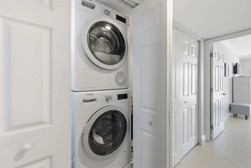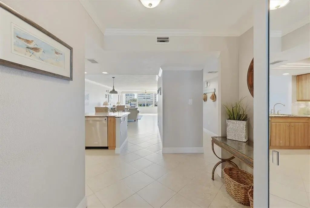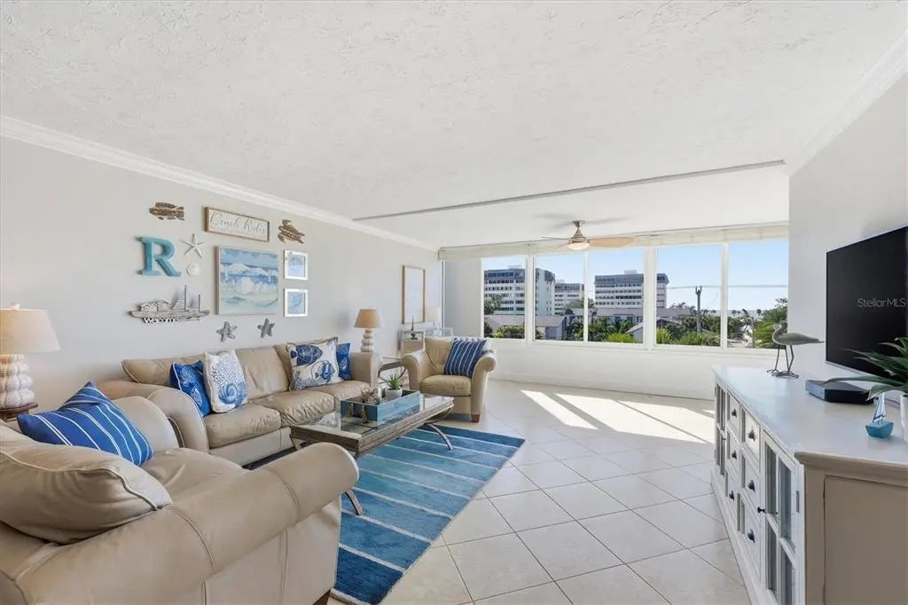 Set within Peppertree Bay on Siesta Key, 1200 E Peppertree Lane #307 offers a well-proportioned, turnkey, move-in ready two-bedroom, two-bath residence encompassing 1,466 square feet. The interior presents a bright, open layout anchored by a spacious great room, where crown molding, tile flooring throughout, and an expansive wall of impact glass windows create an airy, light-filled living environment. The adjoining dining area flows seamlessly into the kitchen, reinforcing the home’s functional, connected design. The kitchen features a tray ceiling with inner crown molding, recessed lighting, abundant wood cabinetry, granite countertops, a tile backsplash, and a full suite of stainless-steel newer Whirlpool appliances. A breakfast bar provides additional prep and serving space, supporting both everyday living and casual entertaining. The primary bedroom is generously scaled and benefits from strong natural light, crown molding, a walk-in closet, and direct access to the enclosed sunroom. The primary bath includes a granite-topped vanity, glass-enclosed walk-in shower, linen storage, and updated fixtures. A well-sized guest bedroom with an oversized window alcove and a nearby full bath maintains privacy and flexibility for visitors. An enclosed sunroom lined with windows extends the living space, offering versatility as a lounge, office, or secondary sitting area. A stacked washer and dryer are conveniently positioned within a dedicated closet. Newer HVAC system (2024) and Water heater (2025). Peppertree Bay is a Gulf-to-Bay community providing private deeded beach access, a fishing pier, two resort-style heated pools, clubhouses, a fitness center, saunas, tennis and pickleball courts, covered under building assigned parking with this unit that provides a bicycle rack and unit storage, and multiple outdoor gathering areas. This building has newer elevators along with stairwell access, with the building roof being replaced in 2020. The location places residents directly on Siesta Key, home to Siesta Beach, consistently ranked the #1 beach in the United States by TripAdvisor, further underscoring the appeal of both the setting and lifestyle offered by this residence.