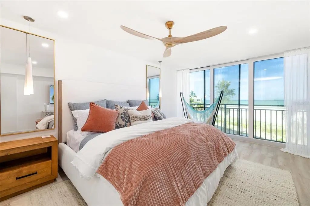 Experience the ultimate beachfront lifestyle in this stunning two-bedroom, two-bathroom condo that's been completely renovated with fresh style and modern touches. With 1,464 square feet of thoughtfully designed living space, this home offers breathtaking full views of the Gulf of Mexico and pristine beach right outside your door. Step inside to discover a bright, open layout that maximizes both comfort and those incredible water views. The recent renovation means everything feels brand new, from the sleek finishes to the updated amenities throughout. Both bedrooms are generously sized, including a spacious primary bedroom that serves as your personal retreat after days spent soaking up the Florida sunshine. The location puts you in the heart of Siesta Key's most desirable area, just steps from the famous powdery white sand beach that draws visitors from around the world. When you're ready to explore, Siesta Key Village is practically at your doorstep, offering an amazing collection of restaurants, shops, and entertainment options. Whether you're craving fresh seafood, tropical drinks, or just shop, the village has something for everyone. The building features a huge community pool perfect for lazy afternoons when you want a break from the beach. For daily needs, Morton's Siesta Market is conveniently nearby, and Boyd Park offers additional outdoor recreation options.